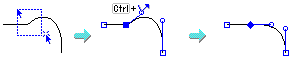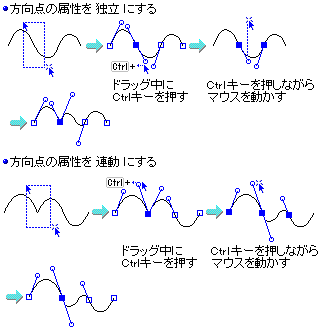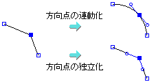 Ctrlキーを押すと、方向点の属性が[連動]の場合は[独立]に、[独立]の場合は[連動]になります。
