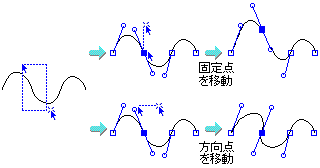 [図形の選択(部分選択・変形)]をクリックします。 - 属性を変更したい方向点のある固定点を選択します。