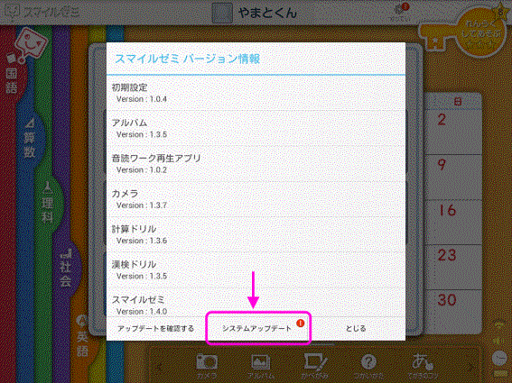 スマイルゼミでは、安定性・操作性の向上、および将来の機能拡張に対応するために、システムアップデート(特別なアップデート)を配信することがあります。