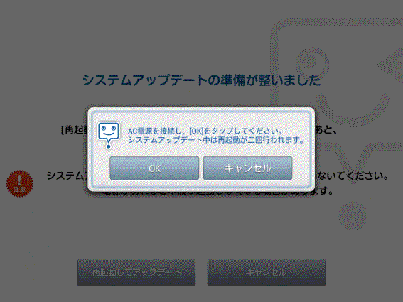 タブレットにAC電源が接続されていることを確認し、[OK]をタップします。