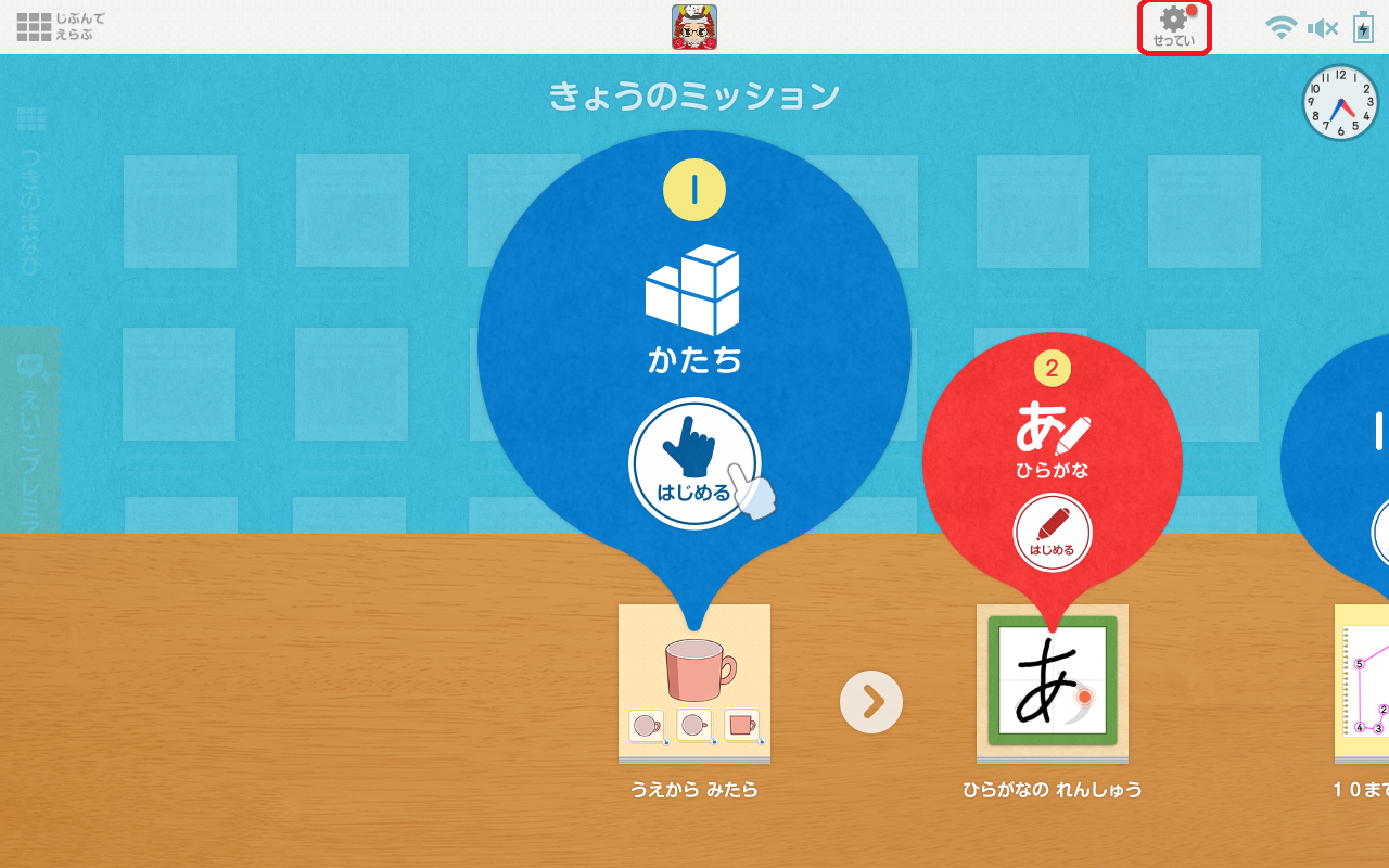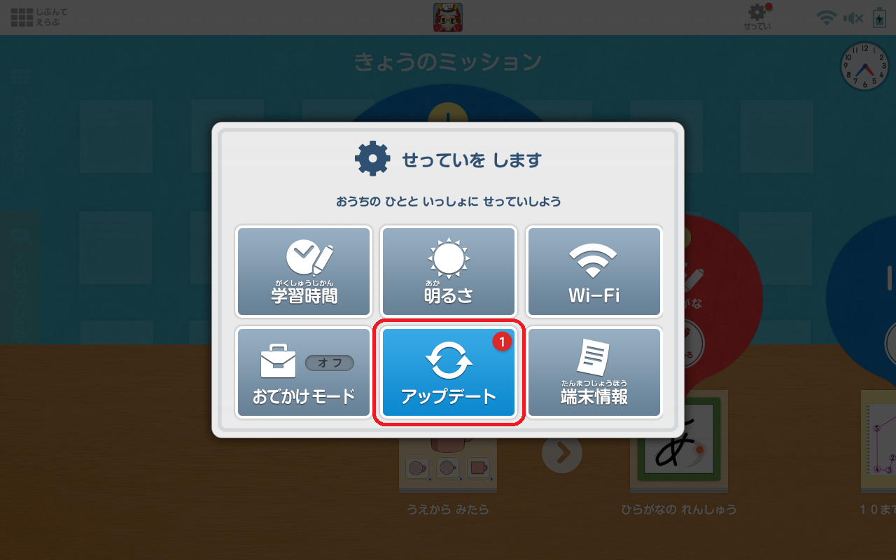 どちらの場合も、未適用のアップデートが配信されている場合、画面右上の[せってい]に赤いマークが表示されます。